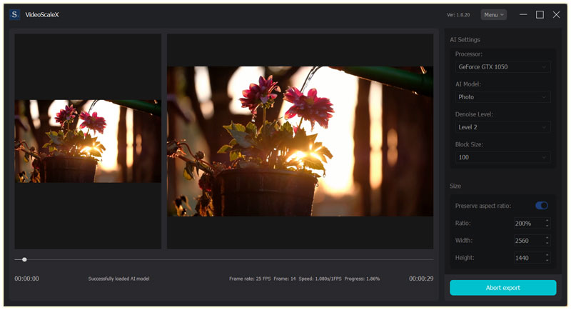 The software automatically selects the GPU to work, achieving efficient transcoding. The CPU usage is basically below 10%, and the single frame amplification from 360P to 1440P is only about 100 milliseconds (the results may not be the same for different computers)